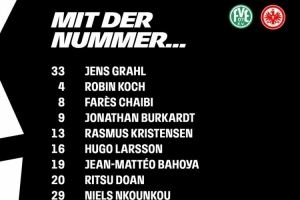 法兰克福首发:33-格拉尔、4-科赫、8-查伊比、9-布尔卡特、13-拉斯穆斯-克里斯滕森、16-雨果-拉尔森、19-巴霍亚、20-堂安律、29-恩库恩库、34-纳姆迪-科林斯、42-乌尊