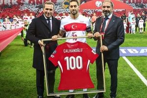 恰尔汗奥卢在对阵保加利亚的比赛中达成国家队出战100场里程碑,此役赛前土耳其队向他颁发了纪念球衣。