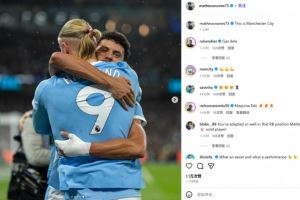 他也在赛后通过社媒晒出两人相拥庆祝照,并配文“这就是曼城!”