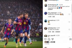 德容社媒晒出与莱万庆祝进球的合照,配文:“球队展现了很棒的态度,收获一场重要的胜利。”