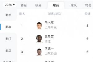 在本轮贡献1传1射后,连续5轮联赛送助攻的申花中场高天意的助攻数来到8个,继续领跑助攻榜,奥乌苏、李源一则以6次助攻并列排在第二位。